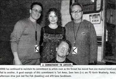 Rebecca Cox scanned a photo of Tori posing with various personnel of radio station KROQ in Los Angeles, CA. The black and white photo appeared in the March 17, 2000 issue of Radio & Records Magazine. The photo show Tori with program director Kevin Weatherly, DJ Jed The Fish, and Gene Sandbloom. The article was about KROQ.